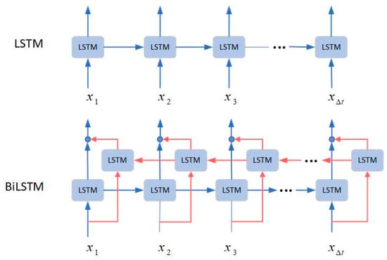 The BiLSTM [33] neural network structure contains a forward LSTM cell and a backward LSTM cell. The BiLSTM can fully mine time series information and has shown outstanding performance capacity in time series prediction tasks [27,29,53]. Figure 3 shows a comparison between LSTM and BiLSTM. We can see that BiLSTM performs not only forward, but also backward, extraction of features compared with LSTM. To extract bi-directional features from sequence data, we use the BiLSTM as the main component to construct the dual encoder and decoder model. To provide a deeper understanding of BiLSTM, we give the detailed calculation process of LSTM.