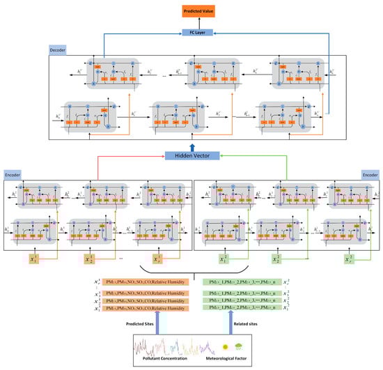 For multivariate time series, one hidden layer cannot express all the information. Adding hidden layers may give more accurate results. The general approach is to stack multiple hidden layers [54] and use the output of the previous hidden layer as the input of the next hidden layer. Since both temporal and spatial features are considered in our study, simply adding hidden layers cannot solve the complex data feature problem. Therefore, we propose the use of a dual encoder and decoder model (ED-BiLSTM) based on BiLSTM. Figure 5 shows the model structure, which consists of two parts: the encoder and the decoder. One of the encoders encodes the temporal features obtained from MRMR, and the other encoder extracts spatial features from adjacent sites. Then, the encoded vectors from both encoders are aggregated and fed into the decoder for prediction. The ED-BiLSTM prediction model will be more beneficial for calculating the grid space interpolation without monitoring stations.