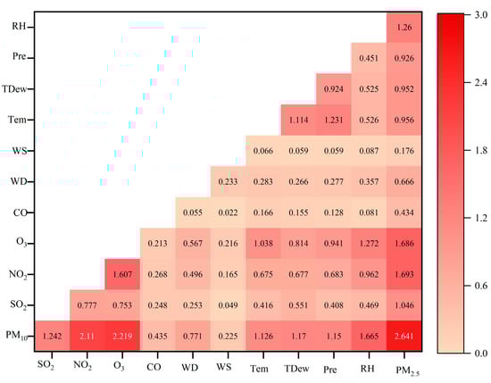 PM2.5 concentration is affected by other atmospheric pollutants, meteorological conditions, and the concentration of PM2.5 at adjacent sites. However, in short-term predictions, the presence of multiple feature variables may result in information redundancy and reduce the prediction model’s accuracy. To eliminate information redundancy caused by excessive features, we calculated the MI of PM2.5 using other pollutants, meteorological factors, and the MI on PM2.5 from adjacent sites.