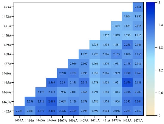 We conducted experiments by inserting a subset of features, determined by two feature selection algorithms based on mutual information and the MRMR algorithm, into the prediction model. Table 4 shows the values of evaluation metrics for different feature input prediction models. The MRMR algorithm obtained the optimal feature set. Then, we added the remaining features to the subset of features using an incremental search algorithm. We found by comparing the model evaluation metrics that the features identified by the MRMR algorithm at k = 6 could be used to achieve the best prediction results. Therefore, the input feature subset of the prediction model contains PM2.5, PM10, NO2, SO2, RH, and CO. In addition, we calculated the mutual information value for PM2.5 concentration between adjacent stations. Figure 7 shows a strong correlation between PM2.5 concentrations at adjacent sites. Comparing the model before and after adding spatial features, we found that RMSE decreased by 12.2% and MAE decreased by 27.3% after adding spatial features. Based on the feature selection algorithm, we used PM2.5, PM10, NO2, SO2, RH, CO, and PM2.5 from adjacent sites as inputs in the prediction model.