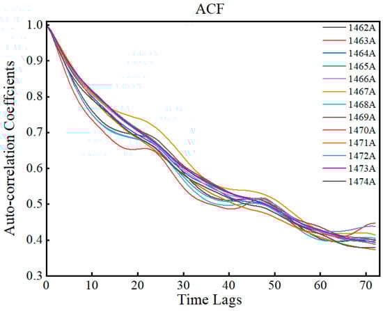 As a measure of correlation, the ACF describes the degree of correlation between values over time. For the time series , the ACF between the values of and can be measured by Equation (9). A larger ACF value indicates a stronger correlation between and .