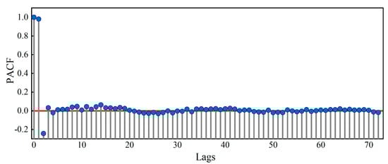 Compared to ACF, PACF is more focused on the correlation between and . The PACF of and is the correlation coefficient between and after removing the indirect effects of . The formula of PACF is shown in Equations (10)–(12). When the value of PACF is closer to 0, it indicates that the correlation between and is weaker.