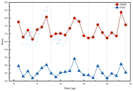 To further determine , we construct training samples with ∆t in the range of [1,24] in order to train and make predictions using ED-BiLSTM. The model prediction results under different settings are shown in Table 5. As seen in Table 5, when ∆t is set to 4, the RMSE is 6.603, the MAE is 4.066, and the prediction model has the most minor error. To see the effect of ∆t more intuitively on the prediction performance, we plot the line graphs of RMSE and MAE for different time lags in Figure 10. There is a similar trend between the RMSE and MAE, and a regular pattern can establish that the prediction error is more minor when ∆t is a multiple of 4. This is in agreement with the conclusion reached by performing PACF, and is also confirmed by the study of Huang et al. [9]. Through ACF and PACF calculations, we set ∆t to 4, which means that when predicting , , , and are input into the prediction model.
