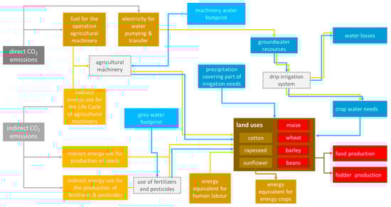 The different nexus dimensions are depicted in different colors. The land uses in brown at the center of the conceptual model represent the agricultural land covers of the different crops of the cooperative. The water component is shown in deep and light blue. Deep blue is used when the water use is direct actual water consumption, within the spatial boundaries of the case study; light blue is used when the water use refers to indirect consumption expressed through the water footprint of involved processes and infrastructure/materials [6,31,33,34,35]. The elements related to energy are represented in deep and light yellow. Deep yellow is used for actual energy consumption, within the spatial boundaries of the case study; light yellow is used for indirect energy uses as revealed by the life cycle assessments implemented for the different materials and processes [32,35]. Greenhouse gas (GHG) emissions are shown in grey. The grey box shows the production of GHGs. GHGs are an indicator of human pressure on climate and a driver of climate change. They are not considered a resource in the conventional way that water and energy are. However, for the needs of our analysis the convention that GHGs are a “reverse resource” is made. While the boxes of the other dimensions denote resource consumption, the grey boxes denote GHG emissions. This means that the emission of GHGs is considered as a pressure in the same way that water consumption is a pressure. Light grey and deep grey are used to show direct GHG emissions in the boundaries of our case study, while light grey is used for GHG emission that is indirect and has occurred outside the boundaries of the case study. This is expressed through the carbon footprint concept [36]. The food dimension is depicted in red and represents the food and fodder production of the agricultural activity of the cooperative. The brown land-use box contains some red boxes that correspond to crops that are used for food production, while the remaining land uses are denoted with light brown, for crops that are not used for food, such as the industrial crop of cotton and the energy crops of rapeseed and sunflower.
