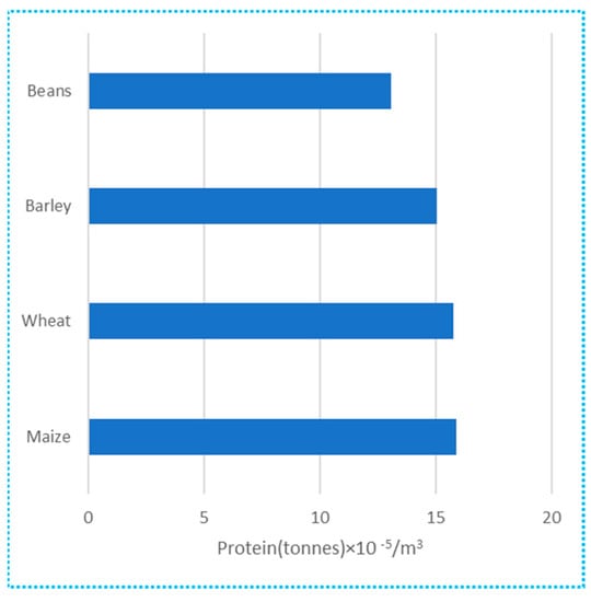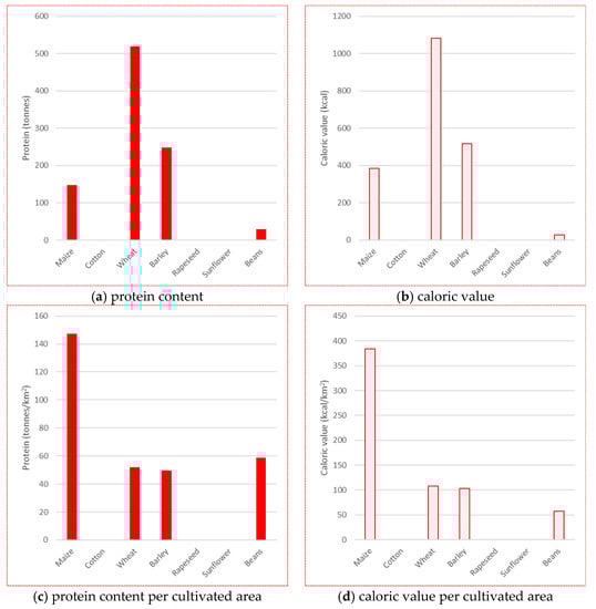 Land Use–Food (LF): LF would involve the land cover of the different crops for food production (Table 1). Other antagonistic agricultural land uses that are not used for food production are also noted to estimate the total irrigation needs for the total of the land uses: The area covered by each of the crops was provided by the cooperative. Maize, wheat, barley, and beans are the crops for food production, while rapeseed, sunflower, and cotton constitute the antagonistic land uses. Apparently, wheat covers almost 50% of the whole area. Food is quantified with the use of a binary expression of protein content in tons and caloric value in kcal [37], taking into account the food and fodder mass production yields of each crop (Hellenic Statistical Authority, 2020) (Figure 3).