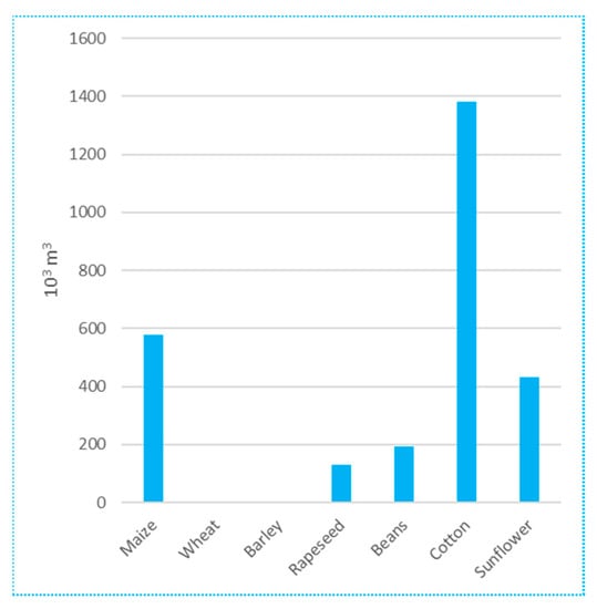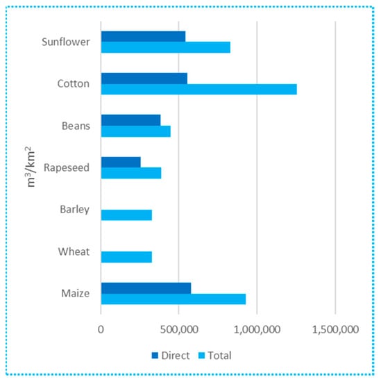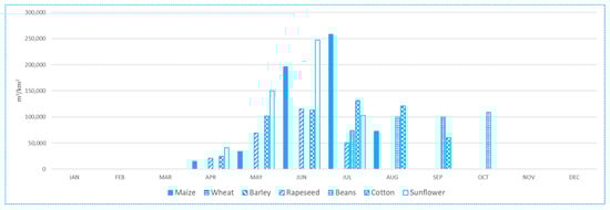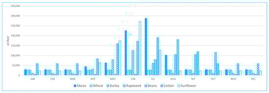 Regarding water consumption per land cover, Figure 16 shows that cotton, sunflower, and maize are the most consuming crops regarding direct water use, over 500,000 m3/km2, but cotton is much more water-intensive regarding total water use. All the necessary amount of water for their growth is covered through the rain; however, they have significant indirect water demands, over 300,000 m3/km2, yet the lowest total. Beans and rapeseed have relatively low direct and indirect water demands. Regarding protein production per water consumption (Figure 17), maize and wheat are the most efficient, and barley and beans follow. Maize has the highest values of Kcal, as well, followed by wheat and barley (Figure 18). The lowest caloric value per water consumption is that of beans. Figure 19 shows that the peak for direct water consumption occurs in the summer, June and July, with maize and sunflower being the greatest drivers. Beans offer the benefit of having a different and smoother peak, almost uniform across the autumn months. This creates relief regarding water consumption in summer, which can be crucial for water deficits in water-scarce regions. Figure 20 follows a pattern similar to that of direct water consumption.