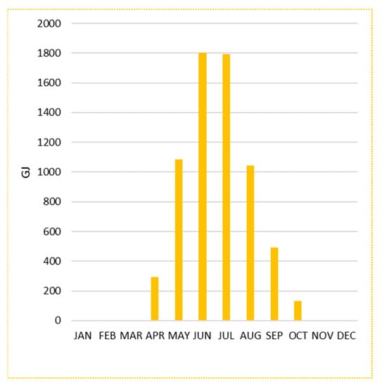 Research work by Mandal et al. [42], Ozkan et al. [43], and Unakitan et al. [44] gives the energy equivalent of human labor in agricultural works (=1.96 MJ/h/farmer); EUROSTAT gives the average annual work effort for Greece in the agricultural sector (=416.9 h); and the Hellenic Statistical Service gives the number of farmers that work on the agricultural land (=20 farmers/km2). It is assumed that all different crop types demand the same work effort and that the effort is uniformly distributed during the year. The annual energy equivalent for human labor is estimated as being equal to 311 GJ, or 15.3 GJ/km2.