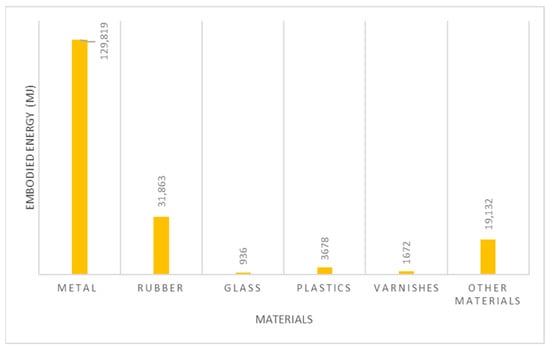 The energy consumed in the various phases of the machinery life cycle, for machinery with engine power from 50 hp to 130 hp, is calculated as an indirect energy–land interlinkage. These tractors belong to the category of medium power and are widely used by Greek farmers [45]. The life cycle analysis of a machine includes the phases of assembly, maintenance, and disassembly. For each of these phases, the total energy required is addressed. The estimations are based on the machinery weight and materials: rubber, glass, plastics, various types of varnishes (including paints), and various other materials used to a lesser extent [32]. Mantoam et al. [35] give the energy (Figure 9) and greenhouse gas emission equivalents for the assembly phase of each material. The total assembly energy of the tractor is estimated as being equal to 187,100 MJ. The energy required to repair and maintain the machine is equal to 0.55 times the energy consumed during the assembly phase [46], while for its disassembly, 0.5 MJ per kg of the machine is consumed [32]. The energy demand for the three phases is presented in Table 15.