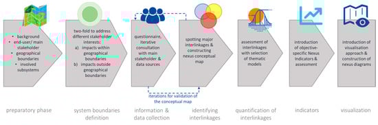 Figure 10 illustrates an overview of the steps followed to conduct the specific nexus analysis of an agricultural context. The steps include (i) the preparatory phase, where the end-user, the case study, and the main systems are identified; (ii) the system boundary definition, where two modes, an internal and an external to the geographical boundaries, are involved to address the concerns of farmers and of a more inclusive audience; (iii) the information and data collection phase; (iv) the interlinkage identification phase, which includes an iterative loop with the previous step; (v) the quantification of interlinkages, where the selection and application of models and empirical equations are conducted; (vi) the introduction and assessment of appropriate indicators, with the use of scenario tests; and (vii) the visualization of results.