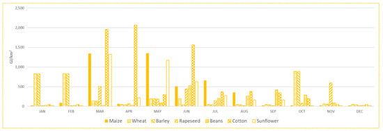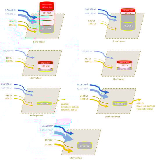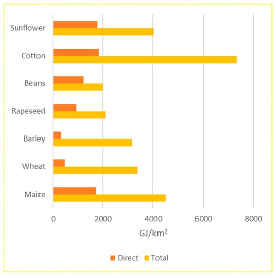 A nexus analysis of an agricultural context implies the assessment of the resources needed to produce the agricultural product, comparing the different crop types regarding the agricultural strategy objectives and priorities, which are linked to the availability of resources. For this reason, all resources are presented as relative values of another nexus component resource, to reveal the benefits and disadvantages in regard to resource use. Figure 11 indicates that sunflower, cotton, and maize consume the most energy regarding direct energy consumption, while cotton consumes by far the most energy also regarding total energy consumption, reaching levels higher than 6500 GJ/km2, whereas the crop with the second highest energy consumption is maize, which demands approximately 4200 GJ/km2. Regarding food production (Figure 12 and Figure 13), maize consumes the least energy, producing high levels of protein and Kcal, over 0.030 protein tons/GJ and over 0.080 kcal/GJ, while beans come second in protein and barley comes second in Kcal. High protein and Kcal per energy consumption would imply beneficial choices in energy crisis and food security policies. Figure 14 and Figure 15 present the monthly direct and total energy consumption of each crop type per land cover, respectively. Regarding the direct use, energy consumption within the boundaries of the case study, there is a peak of energy use around June and July that is caused by maize, rapeseed, and sunflower, while beans and cotton have a different peak in autumn, offering some separation of energy demand. This can be a beneficial characteristic for the bean energy consumption pattern, since it decongests the July peak, reducing the hazard of blackouts. Total energy consumption has different peaks, but this is not representative of what is the case, because energy consumption outside the case study boundaries, such as the energy demand for producing fertilizers and pesticides, is occurring at different times than what is depicted in the diagrams, considering storage and transportation delays. The largest amounts of energy observed in the energy sector are mainly due to the indirect energy inputs of fertilizers.