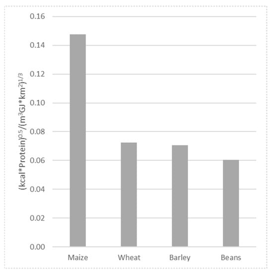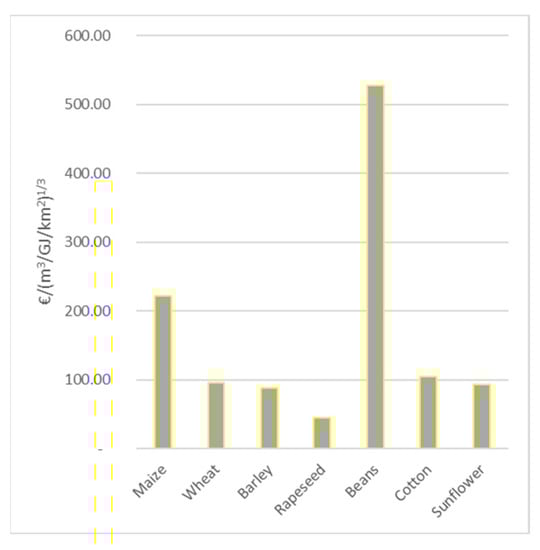 Figure 21, Figure 22 and Figure 23 compare NI1–3 for the different food crop choices. They show that maize is the most nexus-efficient choice (NI1 = 0.15, Table 18), while wheat, barley, and beans depict almost the same efficiency (NI1 = 0.07, 0.07, and 0.06, respectively). It should be noted that beans are of comparable nexus efficiency to wheat and barley, even though wheat and barley are rainfed crops. When the protein content is prioritized, maize is the most nexus-efficient (NI2 = 0.13), again, but wheat, barley, and beans take the same value (0.06). When it comes to economic sustainability, beans are dominantly the most efficient choice with NI3 equal to 528, followed by maize (222). Rapeseed is less efficient, with NI3 equal to 45. It should be noted that cotton, which offers neither food security nor energy security, ranks low in the economic sustainability NI, which means that it consumes a lot of water, energy, and land for the economic benefits it brings, compared to the other crops, especially beans and maize which have higher values but also contribute to food security. Lastly, in a comparison of the energy crops, rapeseed (NI4 = 6.5) shows better efficiency than sunflower (NI4 = 4.0).