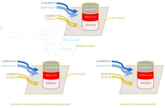The nexus tools presented in the previous paragraphs were tested in two planning scenarios. The current state scenario is named the business-as-usual scenario. The first planning scenario focuses on food security and moderate energy security. For this scenario, 40% of cotton is reduced; 20% of it is shifted to beans, and 20% of it is shifted to rapeseed. At the same time, all sunflower is shifted to rapeseed. In Figure 25, it is shown that from the business-as-usual scenario to scenario A, there are approximate savings of 1,190,000 m3 of total water consumption, 460,000 m3 of direct water consumption, 12,000 GJ total energy, and 3000 GJ of direct energy consumption. At the same time, there is an additional gain of EUR 176,000, 44 tons of proteins, and 29 Kcal. The energy production may have decreased a little, from 5147 to 4755; however, if the total net energy amounts are compared, the business-as-usual scenario has 874 GJ of net energy production, while scenario A has 1895 GJ, an increase of 117%. These improvements can also be recognized in Table 19, where all NIs have significantly increased.