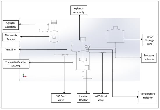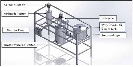 Figure 2 depicts a laboratory biodiesel batch-scale production unit’s 3D visual model in CAD using SolidWorks software (version 2020).