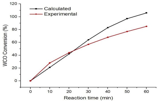 The pattern in the figure shows that as the reaction progresses, the WCO conversion increases into methyl ester. The reactants are consumed and converted into the desired methyl ester as a final product. At the beginning of the reaction, the WCO conversion is zero since no reaction has occurred yet. As the reaction proceeds, the WCO conversion increases and eventually reaches a maximum value. By examining the experimental and calculated values, it was observed that the experimental values are generally higher than the calculated values. This could be due to several factors, such as measurement error, incomplete mixing of the reactants, or variations in the quality of the feedstock. In terms of the scientific reasons for the observed trends in the data, it was noted that several factors, including temperature, pressure, catalyst concentration, and the molar ratio of the reactants, influence the transesterification of WCO into biodiesel. This experiment used a ratio of 5:1 WCO to methanol and 1 wt.% KOH catalyst. These conditions are known to be effective for transesterification reactions but may not be optimal for all systems. Therefore, the observed trends in the data could be influenced by the specifics of the reaction conditions, the feedstock material, and the catalyst’s properties.