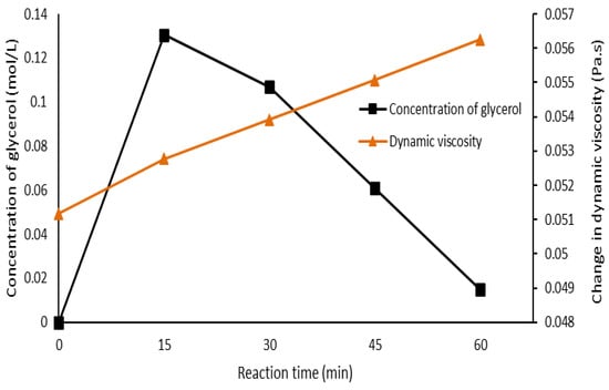 The concentration of the glycerol produced and the dynamic viscosity with respect to the reaction time in the reaction mixture during transesterification is presented in