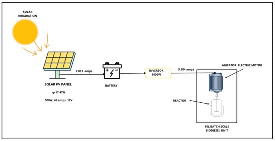 The operation of batch-scale biodiesel production experimental setups with conventional fossil fuel-derived electricity and a solar energy system were compared in terms of the energy consumption (kwh) for 10 L of biodiesel production per batch. The electricity consumption of the electric motor (25 W) for mixing methanol/catalyst for 30 min (0.5 h) at room temperature and drying WCO with a heater (500 W) for 30 min was obtained by multiplying the respective power consumption with the operating time. For the two-step esterification and transesterification reactions, the reactor vessel mixing via an electric motor of 250 W and a heating element of 500 W was multiplied by 1 h, the total operating time, to calculate its electrical energy consumption. After water washing, the final product, biodiesel, was dried in a distillation unit using a heating and magnetic stirrer (C-MAG HS 10, Carl Roth, Karlsruhe, Germany). The power consumption of the heating and stirring element was 500 W for 1 h.