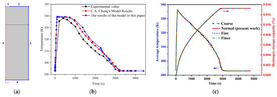 The relevant parameters of the hydrogen storage tank are input into the model. The temperature at the point (0.015, 0.035) under the cooling temperature of 293 K is compared with the experimental and simulated data in the literature [16], to verify the validity of the model, as shown in Figure 1b. It can be seen that the simulation results in this work are in good agreement with the results in Ref. [16]. Figure 1c shows the results of grid independence validation. To meet the accuracy requirement and to ensure a relatively fast calculation speed, the normal density grid is selected in this work. The metal hydride hydrogen storage model developed on the Comsol software platform has been proven to be validated under different ambient temperatures during hydriding and dehydriding in our previous work.