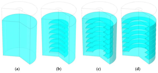 Figure 2 shows hydrogen storage tanks with different fin structures. Figure 2a shows the tank without fins, and it has been described in Section 2.2.2. As shown in Figure 2b–d, the total volumes of the fins are the same for keeping the same amount of hydrogen storage materials. Axisymmetric models of the hydrogen storage tank with different fin structures are built on the Comsol platform. In Figure 2b, the fin radius is 0.01414 m, and the thickness is 0.002 m. The number of triangle units obtained by dividing the grid is 9286, the number of quadrilateral units is 1399, the number of edge units is 661, and the number of vertex units is 35. Figure 2c shows the ring-finned hydrogen storage tank. The fins in the hydrogen storage tank are ring-shaped, located between the symmetrical axis of the hydrogen storage tank and the tank wall, and the thickness of the fins is 0.00133 m. Figure 2d shows a hydrogen storage tank with fins close to the tank wall., and the thickness of the fins is 0.001 m.