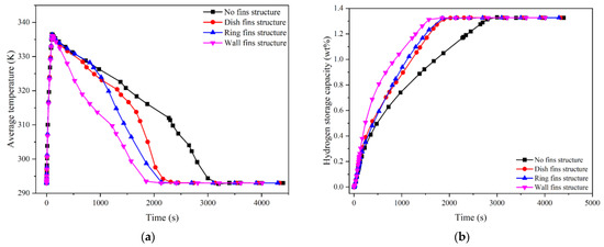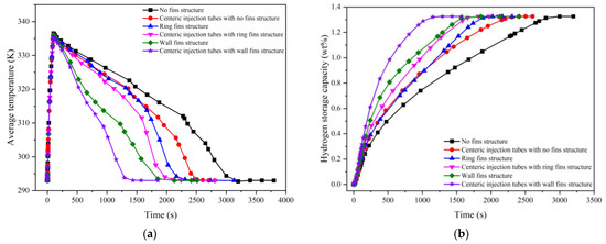 Effects of fin structures of the hydrogen storage tank on average temperature (a) and hydrogen storage capacity (b).