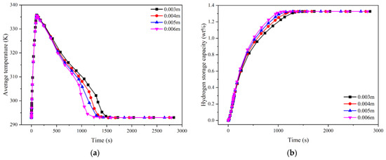 Figure 6a shows the average temperature change of metal hydride hydrogen storage tanks under different injection tube radii. It can be seen that the larger the radius of the injection tube, the faster the average temperature of the metal hydride tank will drop. The shorter time that it takes for the hydrogen storage alloy to cool down to the coolant temperature indicates better heat dissipation performance of the metal hydride tank.
