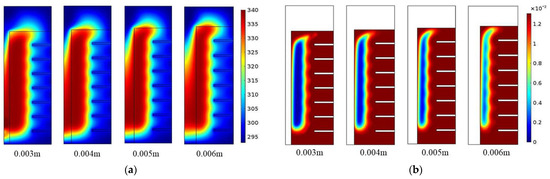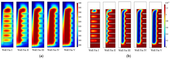Figure 8a shows the average temperature change of the metal hydride hydrogen storage tank under different fin lengths. It can be seen from the figure that the longer the fins, the closer the hydrogen storage alloy in the central zone of the hydrogen storage tank is to the fins. The smaller thermal resistance of the heat transfer from the central high-temperature zone to the fins is more conducive to heat dissipation in the high-temperature central zone of the hydrogen storage tank. Therefore, Wall I exhibited better heat dissipation performance.