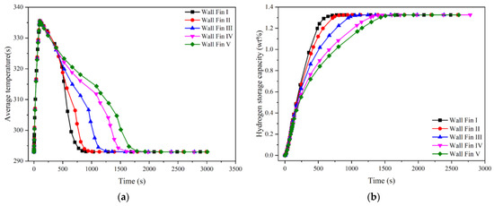 Figure 3b shows the change in the hydrogen storage capacity of the metal hydride tank under different fin structures. The figure shows that the fin structure greatly influences the hydrogen mass transfer characteristics in the tank, and that equipping the fin structure will improve the hydrogen storage performance of the metal hydride tank. Compared with other hydrogen storage tanks, the wall fin tank has better hydrogen storage performance and can make the reaction reach equilibrium within a shorter time. As is shown in Figure 3, the case with the wall fins structure reaches the saturation state almost 1000 s faster than the basic case without fins.
