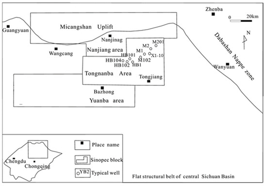 The natural gas resources of the Xujiahe Formation in the Sinopec exploration area are 4.05 trillion cubic meters, and the cumulative natural gas tertiary reserves are 1.52 trillion cubic meters [5]. The proven reserves of the Xujiahe Formation in the northeast of the Sichuan Basin total 738.182 billion cubic meters [6], of which the proven natural gas reserves of the Xujiahe Formation in the Tongnanba block cover an area of 156.42 km2 and reserves of 51.523 billion cubic meters [7]. The block is bounded by the Micangshan structural belt in the north and the Dabashan thrust nappe belt in the east. It mainly contains a NEE-SWW-trending “strip-type” Tongnanba anticline, which is one of the important gas-producing areas in northeast Sichuan. The main gas-bearing layer system is the Upper Triassic Xujiahe Formation, of which the main source rock are subaqueous sandstone deposits of the braided river delta front sub-facies. The reservoir porosity is mainly distributed between 1% and 5%, and the permeability is mainly distributed in (0.01~1) × 10−3 μm2, belonging to ultra-low porosity and ultra-low permeability tight sandstone reservoirs [8].