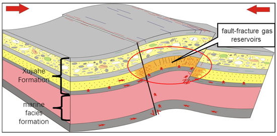 The tight sandstone of the Xujiahe Formation in the Malubei–Tongjiang area was subjected to the compression transformation of the Micangshan–Dabashan in the late Yanshan–Xiashan period, controlled by faults and folds, where faults, fold-associated fractures, and superimposed matrix pores are developed. Large-scale network fracture-pore seepage storage body, that is, fault-fracture zone (Figure 2), is the key to oil and gas enrichment and high production with high-efficiency dual-source charging.