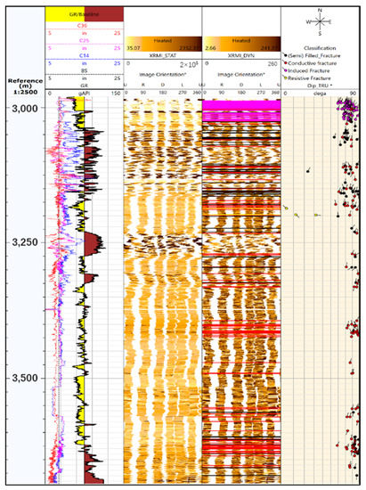 According to the imaging logging interpretation results of Well X1–10, the lithology in Xujiahe formation (2840–3046 m) is mainly sandstone and mudstone interbedded with unequal thickness, where seven high conductivity fractures, five filling fractures and sixty-two stress relief fractures are distributed. Natural fractures were more developed in upper Xujiahe formation (3160–3700 m), where seventy high conductivity fractures are collected, and fault-fracture zones are existed. The imaging logging result of the production well section is shown in Figure 3.