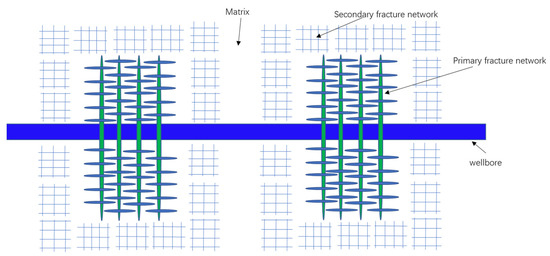 After the horizontal well undergoes fracturing, fractures are generated in the near-wellbore area, and the fractures communicate with each other to form a complex fracture network. Therefore, the model not only considers the main fractures, but also considers the formation of complex fracture networks and high-permeability areas after formation fracturing, that is, the model includes: the main fractures of the fracture, the complex fracture network stimulation area near the wellbore, the affected area of secondary fractures far from the wellbore, and the original reservoir, as shown in Figure 6. The fluid in the affected area flows linearly into the stimulated area, and the fluid in the matrix block in the stimulated area flows into the secondary fracture network, flows linearly to the primary fracture through the secondary fracture network, and flows into the wellbore through the primary fracture, as shown in Figure 6.