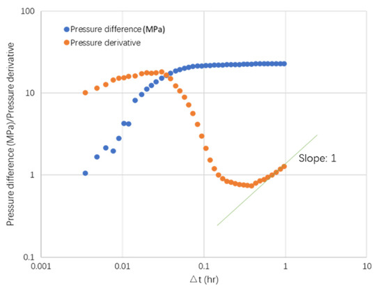 log-log plot of fall-off pressure after shut-in in fault-fracture zone (3rd stage of Well X1–10).