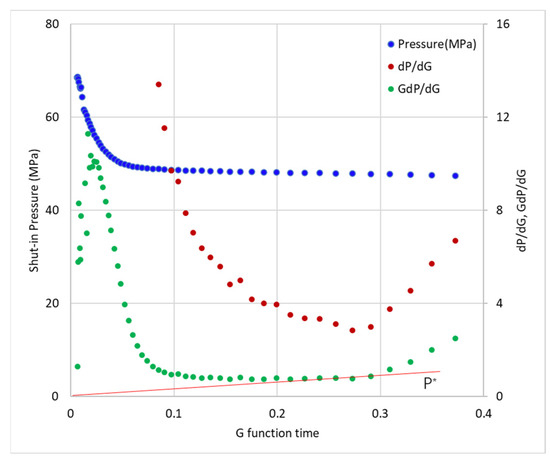 With the log-log plot of fall-off pressure after shut-in of different stages of Well X1–10 (Figure 7, Figure 8, Figure 9 and Figure 10), the fracture closure characteristic appeared with a segment of slope 1. Additionally, the ISIP (instantaneous shut-in pressure) and bottom wellbore pressure could be achieved. p1* (the value of dp/dG in G function) could be obtained with G-function analysis at the fracture closure time determined by characteristic period in log-log plot. The 1–7th stages of Well X1–10 are distributed in the fault-fracture zone (3160–3700 m).