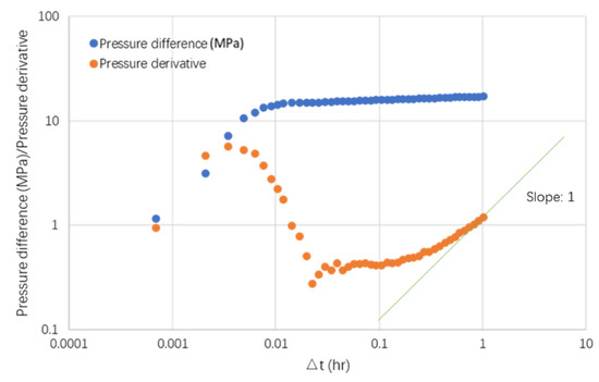 log-log plot of fall-off pressure after shut-in in fracture-underdeveloped area (10th stage of Well X1–10).
