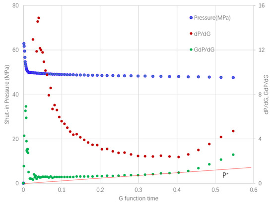 In which pw is bottom wellbore pressure, MPa; ∆t is time after shut in, s; rp is the ratio of fluid loss fracture area and total fracture area; tp is total pumping time, s; Afm and Afn are hydraulic fracture area and natural fracture area, m2; cfm is fracture flexibility; G(∆tD,α) is G function; α is index of fracture area, and its value equals to 4/5 (PKN model) and 2/3 (KGD model); p1* is the value of dp/dG in G function within the fracture closure period.