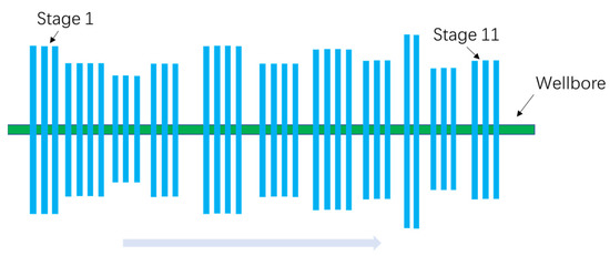 Based on the fracture geometric results from the pressure fall-off model (Table 3.), a multistage fractured horizontal wellbore model was built as shown in Figure 13. Compared to traditional equal-length fracture model in well-test analysis, the differential fracturing model for horizontal wells integrates the differences in the effectiveness of fractures across different segments, providing a more accurate description of the fractures and avoiding the issue of uniform fracture size associated with the homogenized model. This enables more precise analysis and prediction of productivity control by different levels of fractures through methods such as production profile testing.