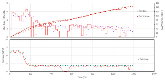 Based on the 3D geological model with fractures and flow model (Appendix A) in tight reservoir, a detailed production-pressure dynamic fitting was investigated to obtain the SRV of different clusters with real in situ production data. The fitting results are shown in Figure 14.