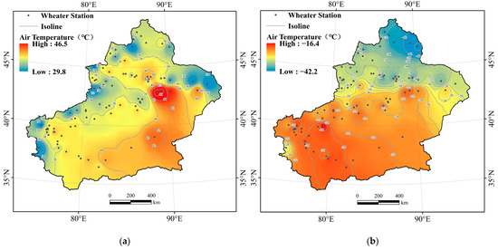 In ArcGIS, the longitude and latitude of 84 meteorological points and 98% reliability of temperature data were input, and the IDW spatial interpolation method was used to obtain the high-temperature isotherm and low-temperature isotherm in Xinjiang, respectively, as shown in Figure 2a,b. The higher temperatures in different areas of Xinjiang under 98% reliability range from 29.8 °C to 46.5 °C, and the lower temperatures range from −16.4 °C to −42.2 °C. Most of the areas are under the climate conditions of hot summer and cold winter.