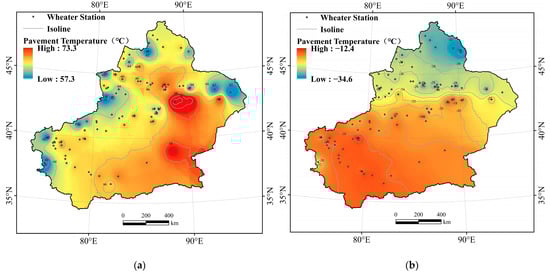 Pavement temperature map with 98% reliability in the Xinjiang region. (a) High-temperature isotherm map; (b) low-temperature isotherm map.