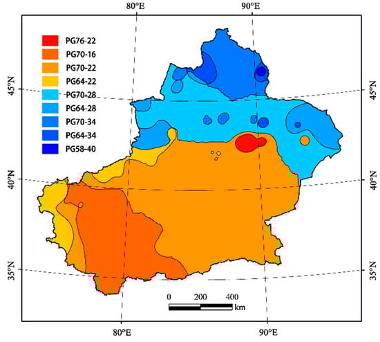 The performance grade of asphalt pavement in Xinjiang was drawn by analyzing the pavement temperature, and finally, nine zones of PG grading were divided, which are PG76-22, PG70-16, PG70-22, PG70-28, PG70-34, PG64-22, PG64-28, PG64-34, and PG58-40, as shown in Figure 4. As can be seen from Figure 4, the four divisions with the largest area share are PG70-16, PG70-22, PG70-28, and PG70-34, indicating that the pavement temperature can reach 70 °C in most areas of Xinjiang during the hot season. The asphalt used in different performance zones in Figure 4 needs to meet the corresponding requirements of maximum and minimum design temperatures so as to ensure the durability and reliability of the road; it also provides a basis for the refined design of asphalt pavements in Xinjiang.
