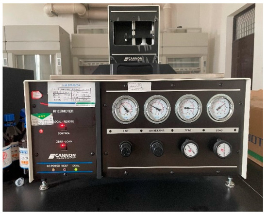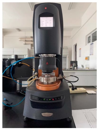 The high-temperature performance of the five asphalts can be measured by dynamic shear rheometer (DSR). The dynamic shear rheometer (DSR) is shown in Figure 5. The device is manufactured by Ta Co., Ltd. from Austin, TX, USA, model CV0150 AR1500ex. The test parameters, such as the composite shear modulus (G*) and the phase angle (δ), can be obtained by testing the relationship between the applied stress and the measured strain. The PG high-temperature performance of asphalt binder is generally characterized by the rutting factor (G*/sinδ) of the unaged asphalt binder and RTFOT short-term-aged asphalt binder.
