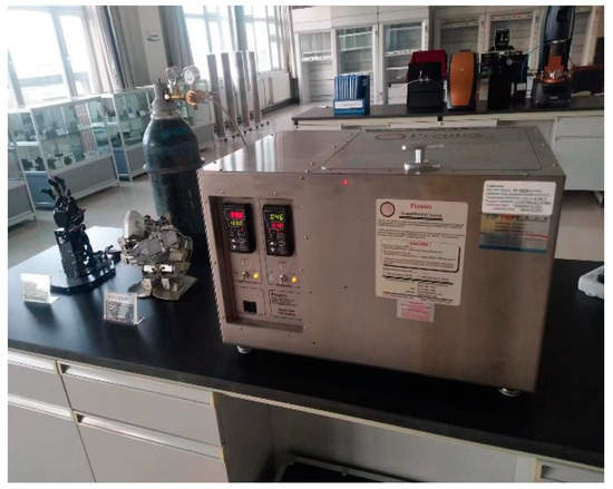 The bending beam rheology (BBR) test can accurately evaluate the ability of asphalt to resist cracking under low-temperature conditions. The bending beam rheology (BBR) is shown in Figure 7. The device is manufactured by CANNON Co., Ltd. from Melville, NY, USA, model PE-BBR-F. The parameters such as creep stiffness modulus S and m-value of asphalt binder are calculated by applying a constant load and measuring the deflection. The S represents the stiffness of the material, and m-value represents the stress dissipation/relaxation capacity due to temperature change. The lower the S value and the higher the m-value, the better the low-temperature performance of the asphalt binder.