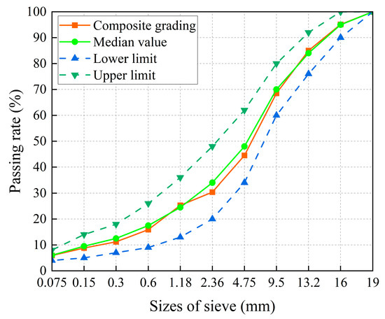 The AC-16 asphalt mixtures were prepared regarding the Marshall design method in this work. The gradation composition of AC-16 is listed in Figure 8. According to the preliminary experiments, the ratio of five kinds of asphalt binders to aggregate was set at 4.5% (90#), 4.6% (70#), 4.6% (50#), 4.7% (30#), and 4.7% (SBS).