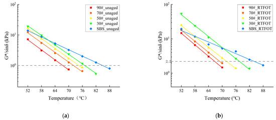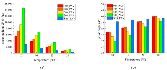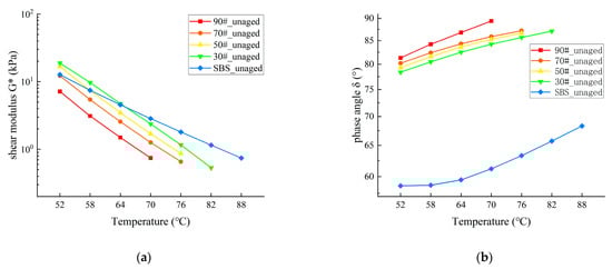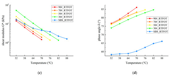 From Figure 11a,b, it can be seen that the composite shear modulus of the five asphalt binders gradually decreases with increasing temperature, and the phase angle gradually becomes larger with increasing temperature. The lower the penetration grade of the matrix asphalt, the higher the composite shear modulus and the smaller the phase angle, which is consistent with the law of unaged asphalt under high-temperature conditions.