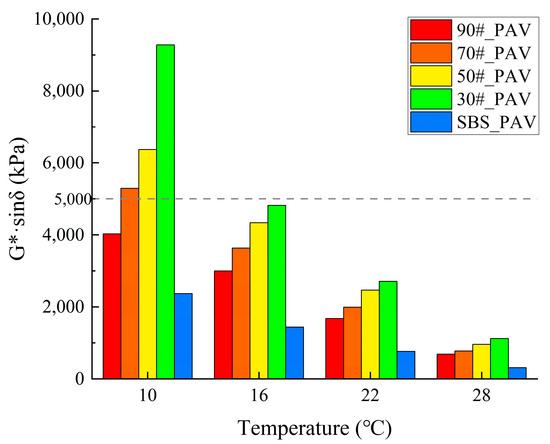 According to the Superpave specification, the fatigue factor (G*·sinδ) was used as the fatigue parameter of the asphalt binder, as shown in Figure 12, which was limited to 5000 kPa as the performance criterion of RTFOT + PAV aging binder at intermediate temperatures. It can be observed that at the intermediate temperature, the fatigue factor size of the five asphalt binders is regular, SBS > 90# > 70# > 50# > 30#, indicating that the lower the penetration grade of the matrix asphalt, the less flexible the asphalt is, which also shows that SBS-modified asphalt has better fatigue performance than the matrix asphalt.