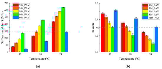 The creep stiffness modulus S and m-values calculated from the BBR tests at three different temperatures (−12 °C, −18 °C, and −24 °C) with a loading time of 60 s are shown in Figure 13a,b, respectively. As shown in Figure 13a,b, the 90# and 70# asphalt binders meet the Superpave requirement at −18 °C, 50# and 30# asphalt binders meet the Superpave requirement at −12 °C, and SBS-modified asphalt reaches the Superpave limit at the temperature of −24 °C.