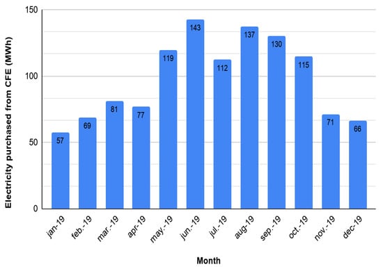 This category includes the indirect emissions from the purchase of electricity from the Federal Electricity Commission (CFE) for the daily operation of the CRGS. The AD is measured as the megawatt-hours purchased during the BY (Figure 1). The months with the highest electricity consumption were May, June, August, September, and October, which are the hottest months of the year and thus relied heavily on air conditioning. The electricity consumption was lower in July because most of the students were on summer break. In total, the CRGS consumed 1178 MWh during the BY.