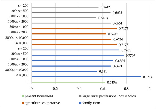 According to the cross-efficiency values of each group of agricultural business entities shown in Figure 2, it can be that the family farms with farmland input of over 10,000 mu have achieved the best efficiency, followed by family farms with farmland input of 200–500 mu, family farms with farmland input of less than 200 mu, agriculture cooperatives with farmland input of 500–1000 mu, and those with a planted farmland input of over 10,000 mu.