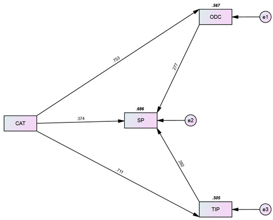 Hypothesis 4a demonstrates that digital organizational culture mediates the relationship between the corporate affinity for technology and sustainable performance. H4a was accepted at a β-value of 0.209 and p < 0.05. Hypothesis H5a states that team innovation performance mediates the relationship between the corporate affinity for technology and sustainable performance. The results indicated that the relationship between team innovation performance, the corporate affinity for technology, and sustainable performance was mediated (β = 0.200, p < 0.05) (see Table 5). Figure 3 shows the results of the structural equation modeling.