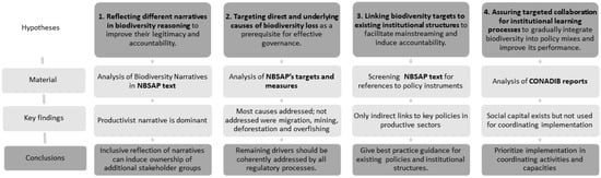 Overview on research process. Four hypotheses were analysed using NBSAP texts and CONADIB reports to extract key findings and conclusions.