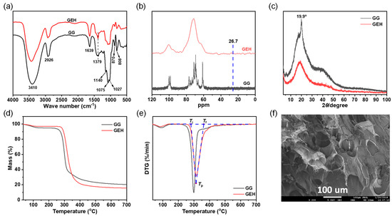 (a) FT-IR of GG and GEHs, (b) 13C-NMR spectra of GG and solid-state 13C-NMR spectra of GEHs, (c) XRD of GG and GEHs, (d) TGA curves of GG and GEHs, (e) DTG curves of GG and GEHs, and (f) SEM images of freeze-dried GEHs.
